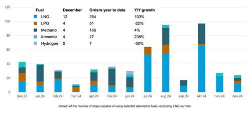 与此同时,DNV的替代燃料洞察(AFI) 数据平台最新统计指出,2024年全球替代燃料船舶订单大幅增长至515艘,与2023年相比涨幅达38%。其中LNG燃料成为了2024年的行业首选,新船订单数量多达264艘,是2023年130艘的两倍以上。此外,甲醇燃料船订单也增至4%达到166艘,占去年替代燃料船舶新船订单的32%,这些订单中的大多数都是集装箱船(85艘);氨燃料船全年新船订单总量增长238%至27艘,去年出现了首批非气体运输船的氨燃料船舶订单(10艘),主要为散货船(5艘)。