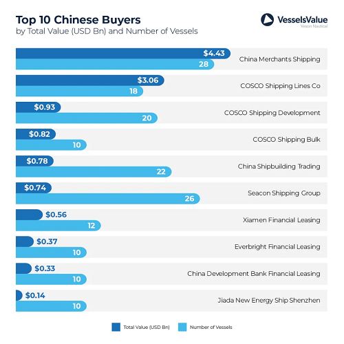 这意味着,VesselsValue这份国内船东新船订单排名中,前五位船东的新船订单全部来自中远海运集团、招商轮船这两大航运央企。