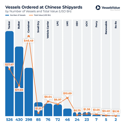 中国船企去年承接的新船订单总金额高达1230亿美元(约合人民币8945.55亿元)。以订单数量来看,油船订单最多共计526艘,总价值274亿美元;排在第二位的则是散货船,总计430艘,价值177亿美元。集装箱船订单数量排名第三,共计298艘,但订单价值却高达460亿美元,远远高于其他所有船型领域。