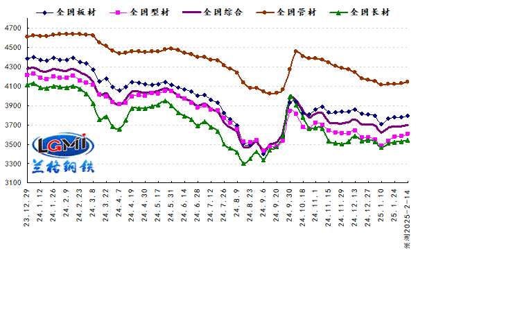 2025年第6周(2025.1.27-2.7)兰格钢铁全国绝对价格指数为3688元,较上周上升0.1%,较去年同期下降13.4%;其中,兰格钢铁长材绝对价格指数为3529元,较上周上升0.2%,较去年同期下降13.7%;兰格钢铁型材绝对价格指数为3588元,较上周上升0.3%,较去年同期下降14.3%;兰格钢铁板材绝对价格指数为3777元,较上周下降0.1%,较去年同期下降13.6%;兰格钢铁管材绝对价格指数为4131元,较上周上升0.2%,较去年同期下降10.9%。