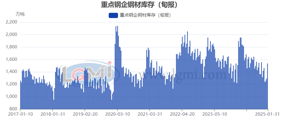 据中国钢铁工业协会统计数据显示,2025年1月下旬重点钢铁企业钢材库存量为1535万吨,旬环比增加242万吨,上升18.7%;比上月同旬增加298万吨,上升24.1%;比去年同旬增加315万吨,上升25.8%。