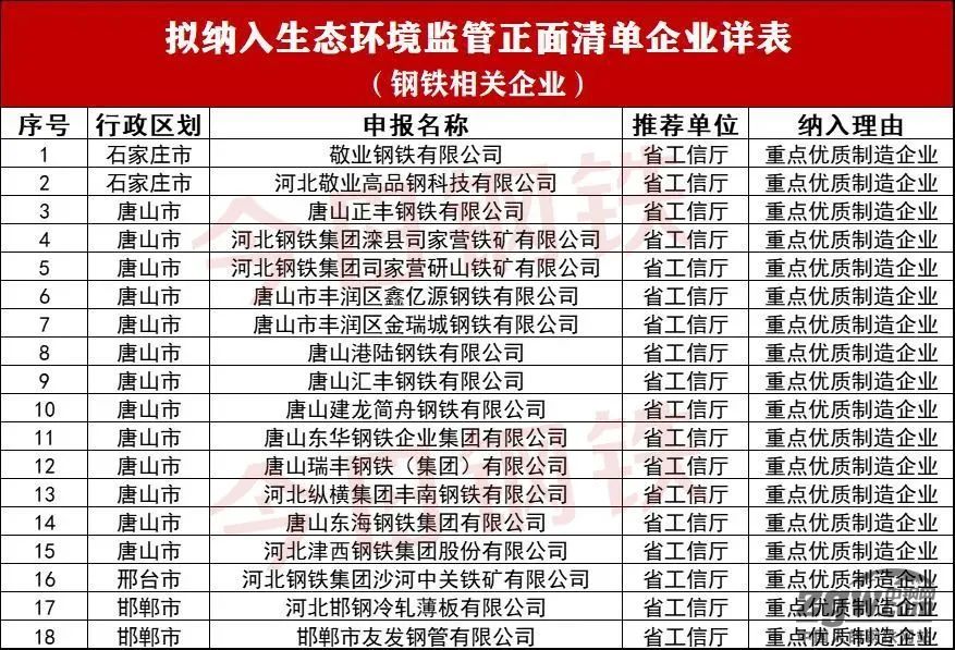 日前,河北省生态环境厅对拟纳入河北省生态环境监管正面清单企业予以公示,1441家企业被纳入该名单,其中钢铁相关企业合计18家。详情如下: