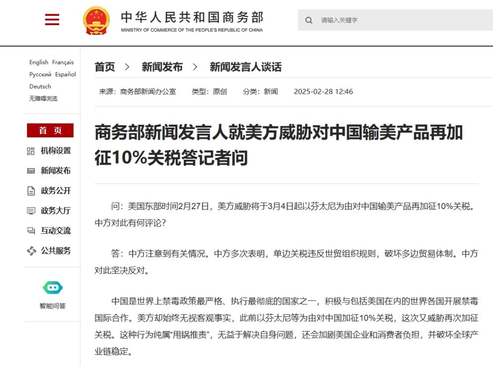 问:美国东部时间2月27日,美方威胁将于3月4日起以芬太尼为由对中国输美产品再加征10%关税。中方对此有何评论?