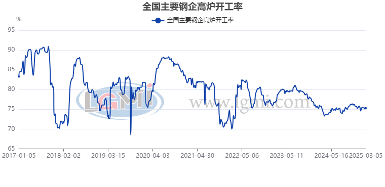从月度高炉开工率变化来看,钢铁企业生产释放呈现小幅波动态势。据兰格钢铁网调研数据显示,2025年2月份全国主要钢企高炉开工率为75.3%,与上月均值持平(详见图4);但全国201家生产企业铁水日均产量均值为224.7万吨,较上月均值减少1.3万吨。从钢厂利润情况来看,2025年2月份以来,钢厂呈现了品种盈亏不一的情况,据兰格钢铁研究中心测算,截至2月底,以两周原料库存测算的两大主要钢材品种处于盈亏不一的局面,其中三级螺纹钢处于小幅盈利超60元,而热卷处于小幅亏损近60元。进入3月份,由于需求旺季在即以及宏观政策预期的共同影响,钢铁企业的生产积极性依然很强,不论高炉开工率还是铁水日均产量均有所提升。