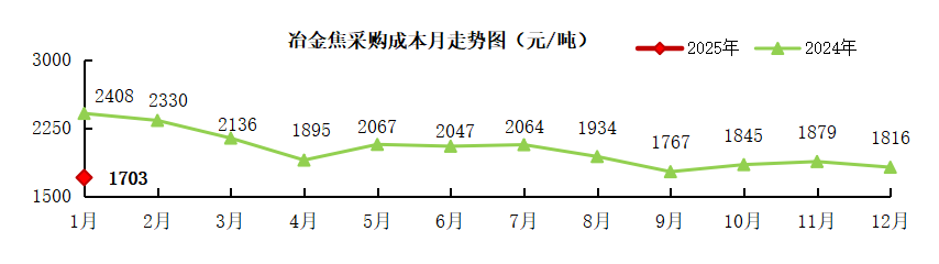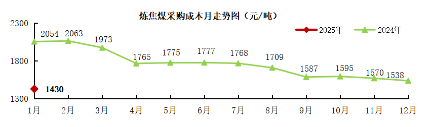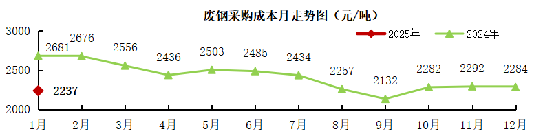 1月份加权平均采购成本为2236.87元/吨,环比减少47.34元/吨,下降2.07%;同比减少444.90元/吨,下降16.59%。