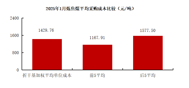 1月对标企业炼焦煤平均采购成本最低的前5家企业折算成干基的加权平均采购成本为1167.91元/吨,比对标企业平均采购成本低261.84元/吨,低于平均采购成本18.31%;而采购成本最高的5家企业的加权平均采购成本为1577.50元/吨,比对标企业平均采购成本高147.74元/吨,高于平均采购成本10.33%。