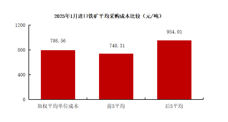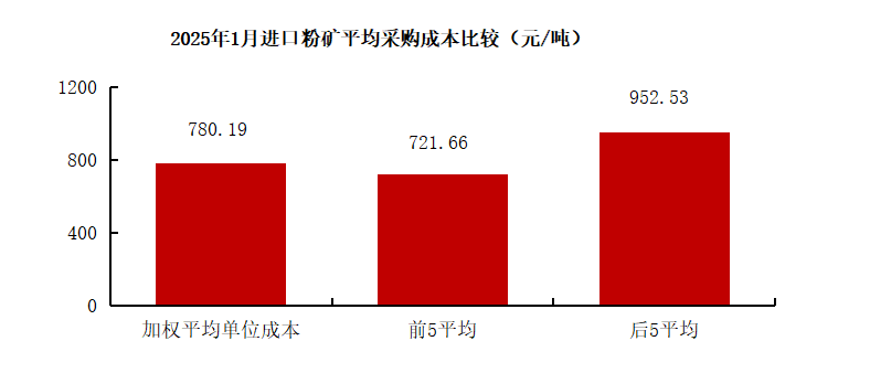 1月对标企业进口粉矿折算成62%品位的平均采购成本为780.19元/吨,成本最低的前5家企业的加权平均采购成本为721.66元/吨,比对标企业平均采购成本低58.53元/吨,低于平均采购成本7.5%;而采购成本最高的5家企业加权平均采购成本为952.53元/吨,比对标企业平均采购成本高172.34元/吨,高于平均采购成本22.09%。