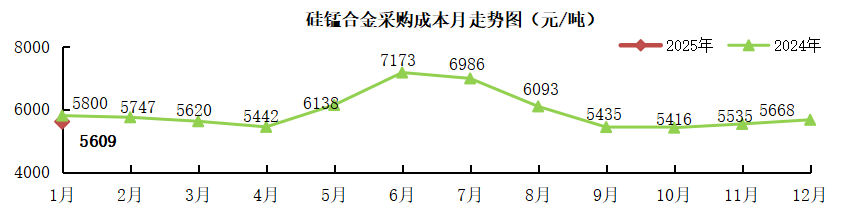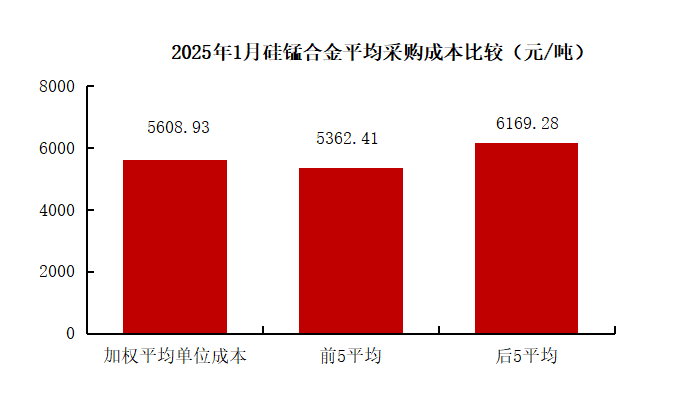 1月对标企业硅锰合金平均采购成本最低的前5家企业的加权平均采购成本为5362.41元/吨,比对标企业平均采购成本低246.53元/吨,低于平均采购成本4.40%;而采购成本最高的5家企业加权平均采购成本为6169.28元/吨,比对标企业平均采购成本高560.34元/吨,高于平均采购成本9.99%。
