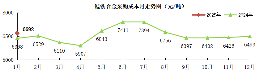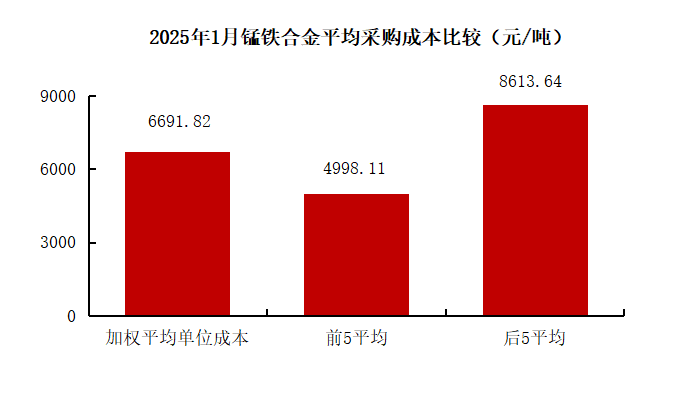 1月对标企业锰铁合金平均采购成本最低的前5家企业的加权平均采购成本为4998.11元/吨,比对标企业平均采购成本低1693.71元/吨,低于平均采购成本25.31%;而采购成本最高的5家企业加权平均采购成本为8613.64元/吨,比对标企业平均采购成本高1921.82元/吨,高于平均采购成本28.72%。