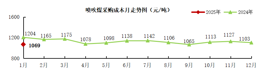 1月份加权平均折算成干基的采购成本为1068.52元/吨,环比减少34.28元/吨,下降3.11%;同比减少135.88元/吨,下降11.28%。