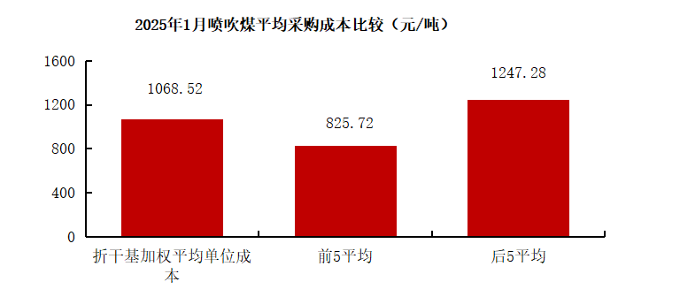 1月对标企业喷吹煤平均采购成本最低的前5家企业折算成干基的加权平均采购成本为825.72元/吨,比对标企业平均采购成本低242.80元/吨,低于平均采购成本22.72%;而采购成本最高的5家企业的加权平均采购成本为1247.28元/吨,比对标企业平均采购成本高178.76元/吨,高于平均采购成本16.73%。