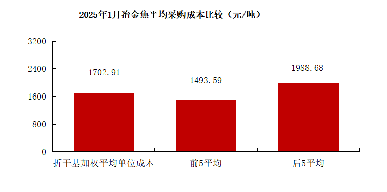 1月对标企业冶金焦平均采购成本最低的前5家企业的加权平均采购成本为1493.59元/吨,比对标企业平均采购成本低209.32元/吨,低于平均采购成本12.29%;而采购成本最高的5家企业的加权平均采购成本为1988.68元/吨,比对标企业平均采购成本高285.77元/吨,高于平均采购成本16.78%。