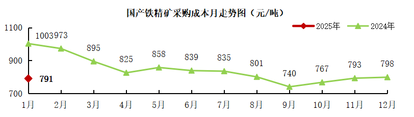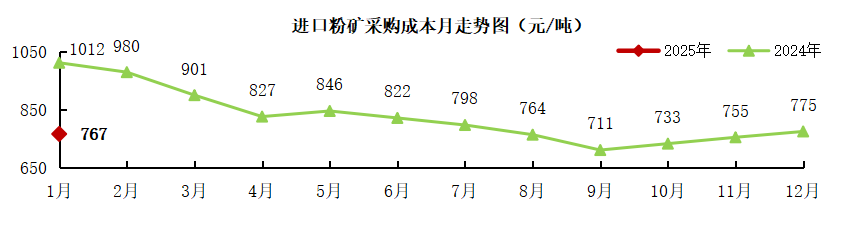 国产铁精矿(干基):1月份加权平均采购成本为790.61元/吨,环比减少7.85元/吨,下降0.98%;同比减少211.91元/吨,下降21.14%。