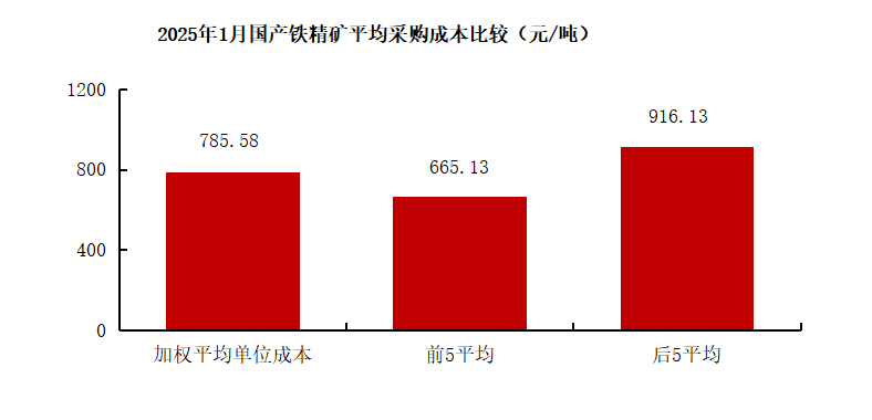 1月对标企业国产铁精矿折算成62%品位的平均采购成本为785.58元/吨,成本最低的前5家企业的加权平均采购成本为665.13元/吨,比对标企业平均采购成本低120.46元/吨,低于平均采购成本15.33%;而采购成本最高的5家企业的加权平均采购成本为916.13元/吨,比对标企业平均采购成本高130.55元/吨,高于平均采购成本16.62%。