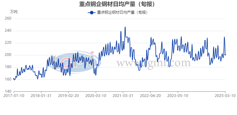 据中国钢铁工业协会统计数据显示,2025年3月上旬重点钢企生铁日均产量188.8万吨,旬环比下降5.0%,同比上升3.6%;3月上旬重点钢企粗钢日均产量213.2万吨,旬环比下降5.6%,同比上升2.4%;3月上旬重点钢企钢材日均产量200.7万吨,旬环比下降12.8%,同比上升4.1%。