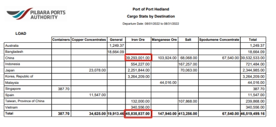 澳大利亚皮尔巴拉港口管理局(PPA)公布:8月澳大利亚黑德兰港铁矿石出口4583.58万吨;对中国铁矿石出口为3929.30万吨,7月为4692.60万吨。