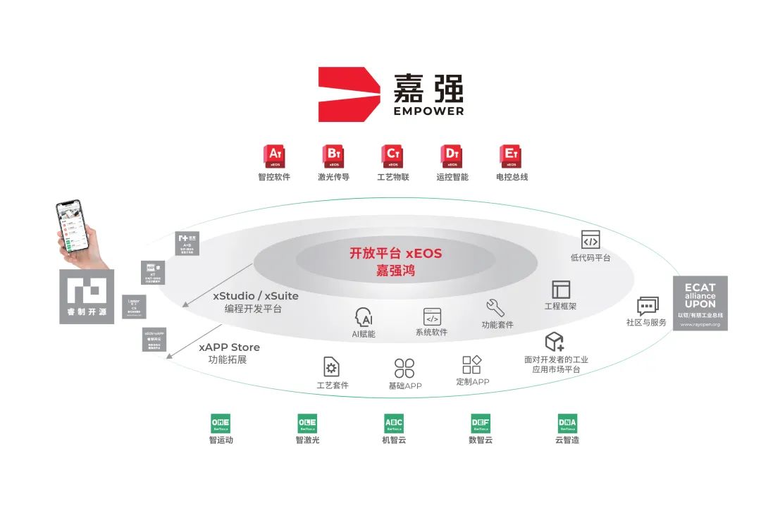 基于国内外技术和上述行业背景,嘉强智能工业级边缘云操作系统xEOS+xAPP应运而生。从控制系统走向操作系统,其本质是通过“软件定义制造”重构激光装备的底层逻辑,将传统以硬件为中心的线性生产系统,升级为数据驱动、开放协同的智能生态网络。
