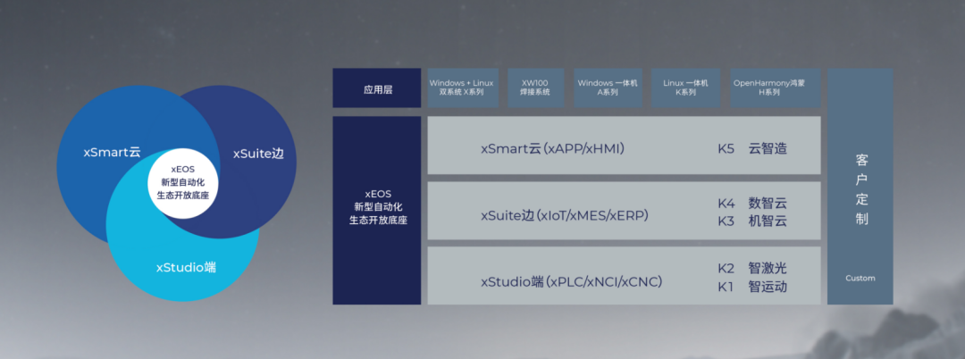 xEOS作为工业4.0 时代智能激光装备、产线、车间的边缘大脑,以一种简单方式将过去独立分散的信息节点接入开放的去中心化模块化系统:机器控制(AT)、信息技术(IT)和物联网(IoT),xEOS基于开源鸿蒙发行版OpenHarmony安全信任的分布式架构,由ECAT/UPON物理链路层和容器化微服务以及虚拟化技术底座xStudio边缘自动化、xSuite边缘数据层及xSmart模型智能决策层三部分构成完整的工业级边缘操作系统。