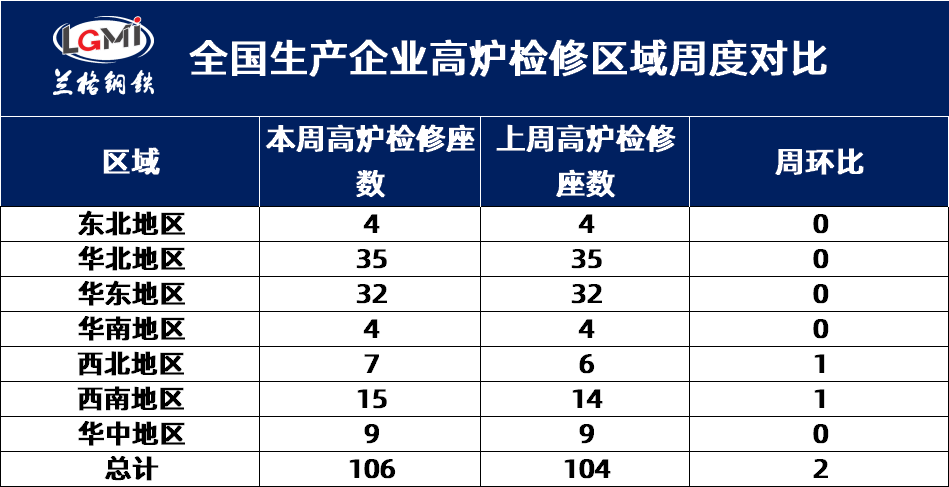据兰格调研:201家样本高炉企业中,有106座高炉检修,较上周增加2座。其中:东北地区4座高炉检修,较上周持平;华北地区35座高炉检修,较上周持平;华东地区32座高炉检修,较上周持平;华南地区4座高炉检修,较上周持平;西北地区7座高炉检修,较上周增加1座;西南地区15座高炉检修,较上周增加1座;华中地区9座高炉检修,较上周持平。