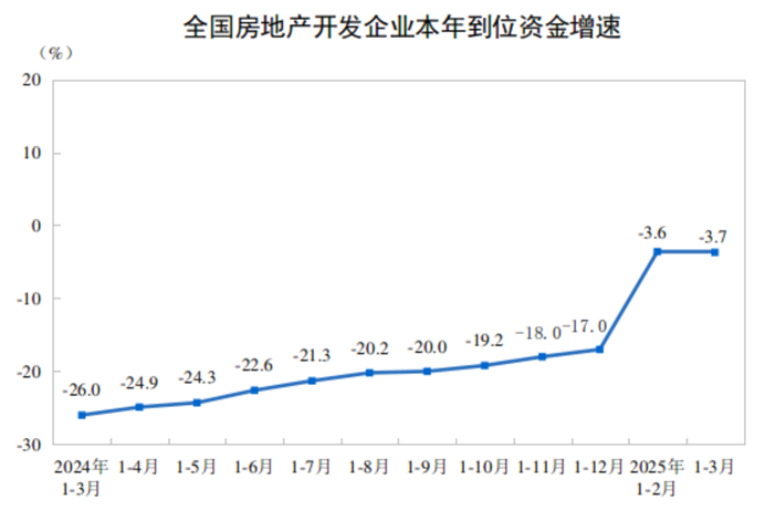 1—3月份,房地产开发企业到位资金24729亿元,同比下降3.7%。其中,国内贷款4441亿元,下降2.3%;利用外资1亿元,下降83.2%;自筹资金8168亿元,下降5.8%;定金及预收款7335亿元,下降1.1%;个人按揭贷款3373亿元,下降7.0%。
