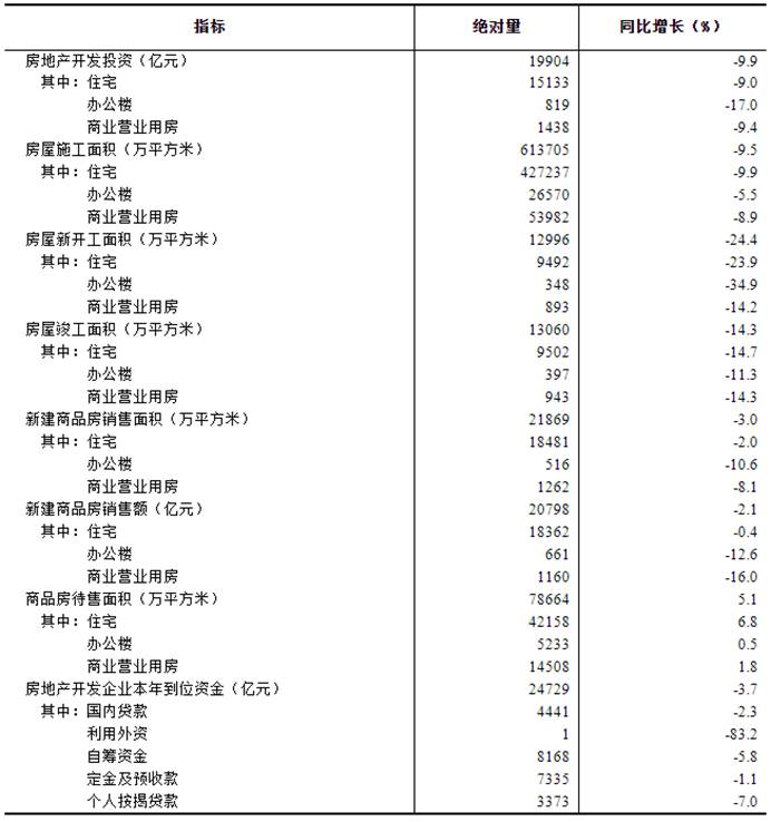 1—3月份,房地产开发企业房屋施工面积613705万平方米,同比下降9.5%。其中,住宅施工面积427237万平方米,下降9.9%。房屋新开工面积12996万平方米,下降24.4%。其中,住宅新开工面积9492万平方米,下降23.9%。房屋竣工面积13060万平方米,下降14.3%。其中,住宅竣工面积9502万平方米,下降14.7%。