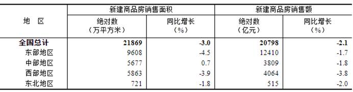1—3月份,新建商品房销售面积21869万平方米,同比下降3.0%,降幅比1—2月份收窄2.1个百分点;其中住宅销售面积下降2.0%。新建商品房销售额20798亿元,下降2.1%,降幅收窄0.5个百分点;其中住宅销售额下降0.4%。