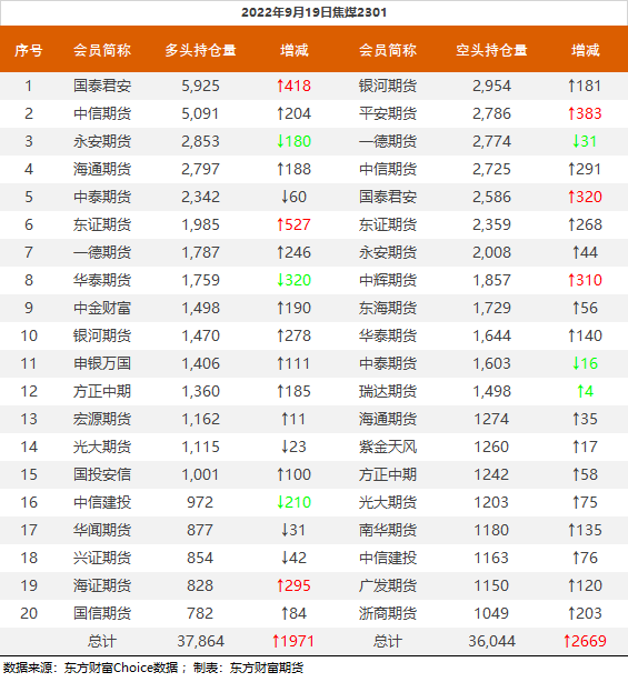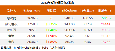 截至9月19日收盘,螺纹钢2301收3696元/吨;热卷2301收3750元/吨,跌0.35%;铁矿石2301收705.5元/吨,跌1.4%;焦炭2301收2658.5元/吨,涨1.9%;焦煤2301收2036元/吨,涨1.85%。