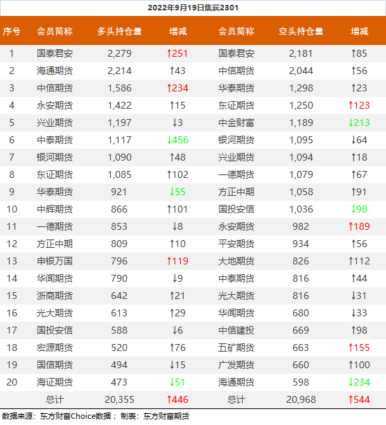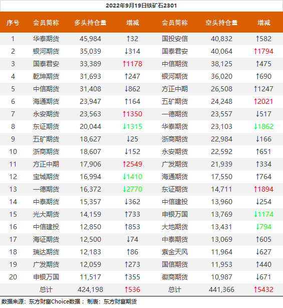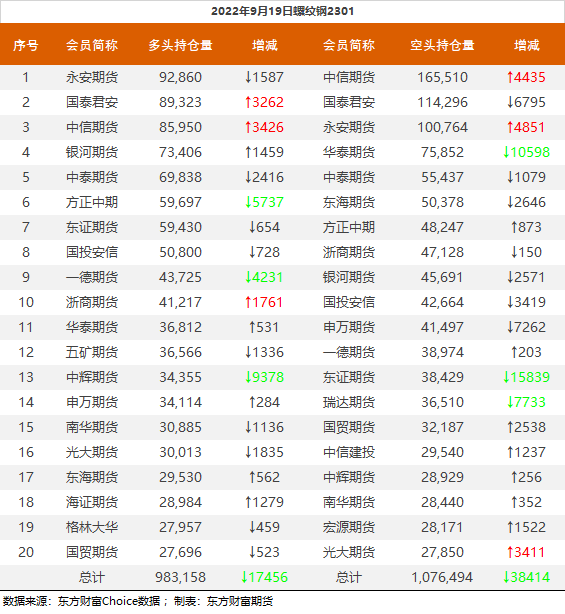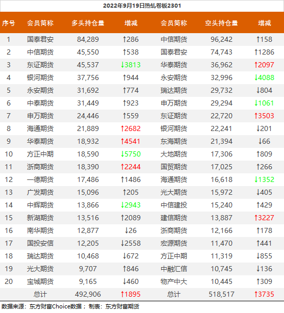 螺纹钢2301合约前20席位多单减仓17456手至98.3万余手,空单减仓38414手至107.6万余手,整体净空93336手。其中华泰期货多单增持531手,空单减持10598手。