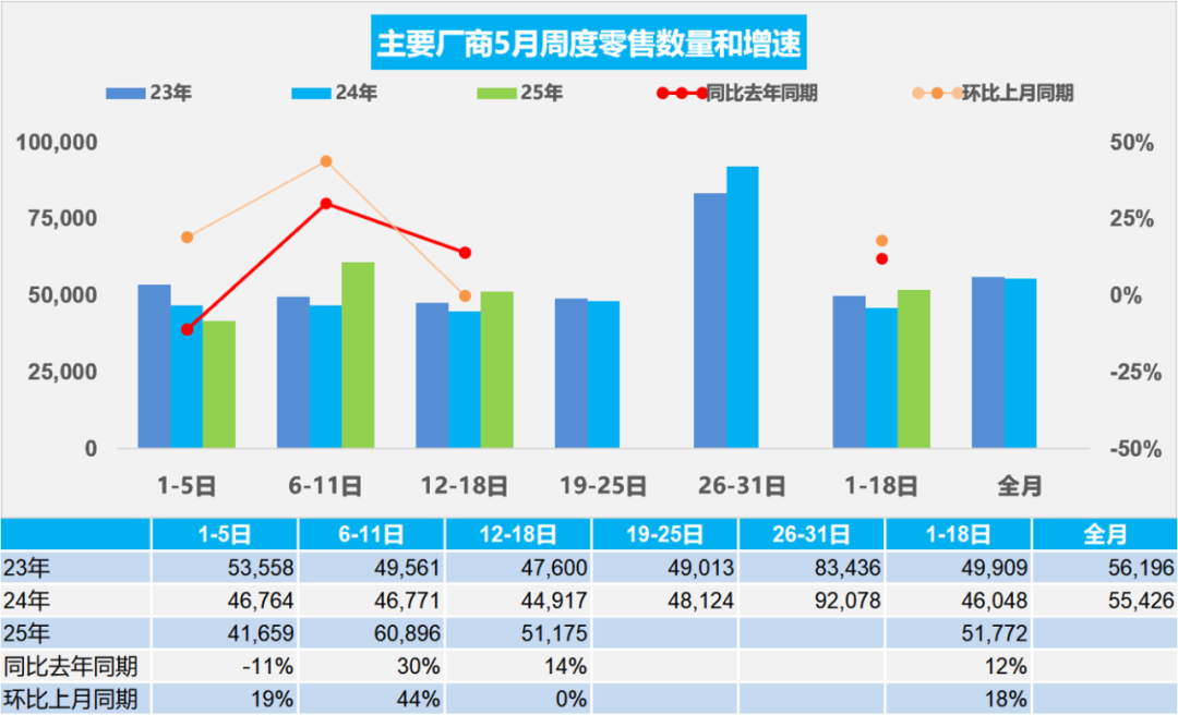 5月第三周全国乘用车市场日均零售5.1万辆,同比去年5月同期增长14%,较上月同期增长0%。