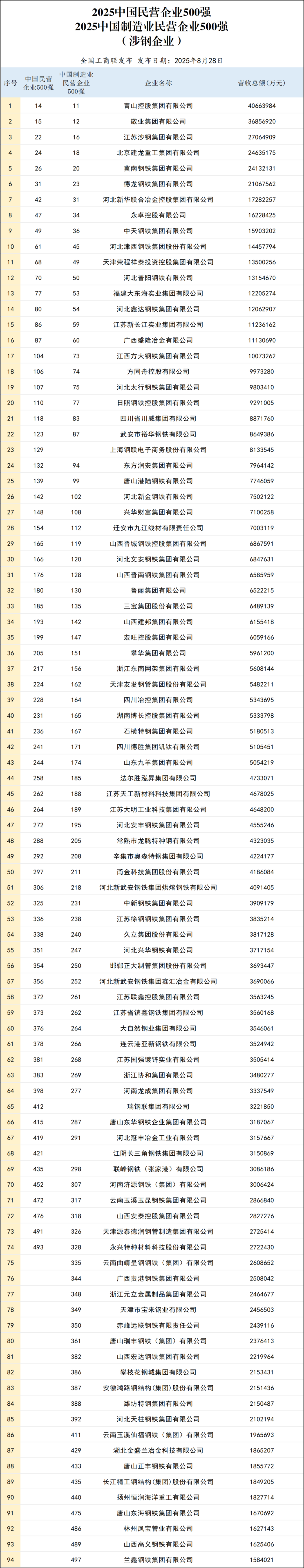 74家涉钢企业上榜“2025中国民营企业500强”,91家涉钢企业上榜“2025中国制造业民营企业500强”