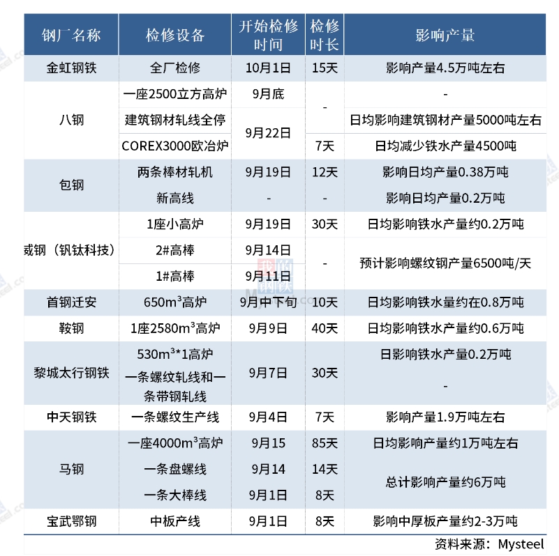 9月份钢厂检修及生产情况