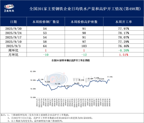 据兰格钢铁网监测数据显示,2025年9月30日全国201家生产企业中有54家钢厂共计91座高炉检修停产,总容积为99080立方米,较上周增加2220立方米,按容积计算主要钢铁企业高炉开工率为77.97%,较上周下降0.2%。