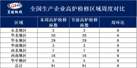 据兰格调研:201家样本高炉企业中,有91座高炉检修,较节前持平。其中:东北地区3座高炉检修,较节前持平;华北地区28座高炉检修,较节前持平;华东地区29座高炉检修,较节前持平;华南地区3座高炉检修,较节前持平;西北地区7座高炉检修,较节前持平;西南地区16座高炉检修,较节前持平;华中地区5座高炉检修,较节前持平。