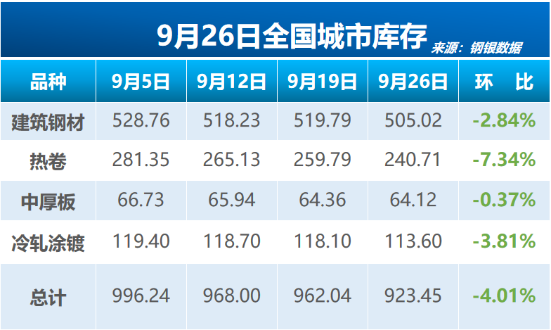 本周全国城市钢铁库存环比减少38.59万吨 降幅4.01%