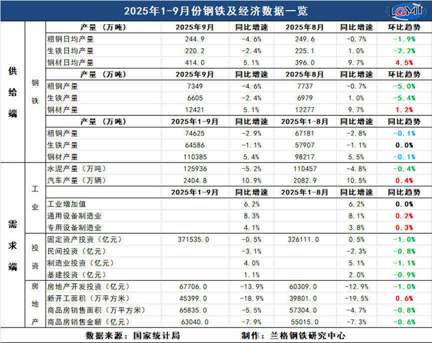 兰格追踪:2025年1-9月钢铁及经济数据一览