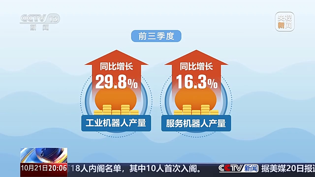 第三季度,我国规模以上高技术制造业增加值同比增速明显快于全部工业;信息传输、软件和信息技术服务业增加值增长11.7%,比上年同期加快1.7个百分点。前三季度,规模以上高技术制造业增加值同比增长9.6%;工业机器人、服务机器人等产品产量分别增长29.8%、16.3%。