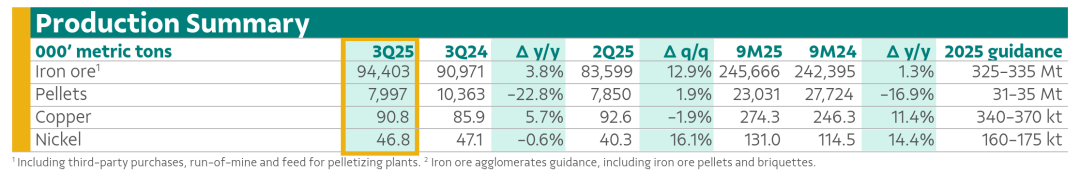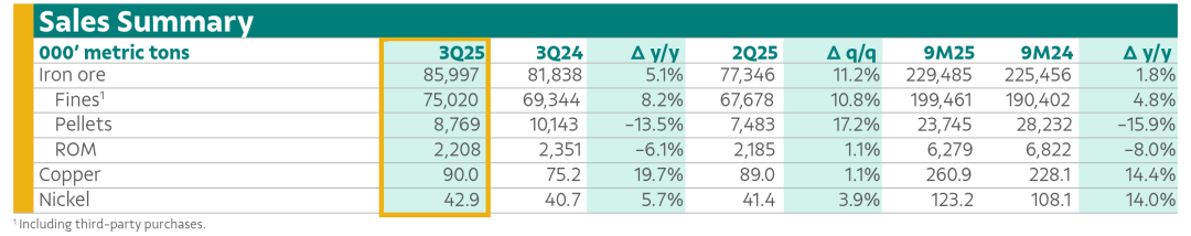 2025年第三季度,铜产量总计9.08万吨,同比增长0.49万吨,增幅为6%,主要得益于萨洛博运营区的稳定产出,以及沃伊斯湾(Voisey’s Bay)运营区和萨德伯里运营区铜精矿产量提升。