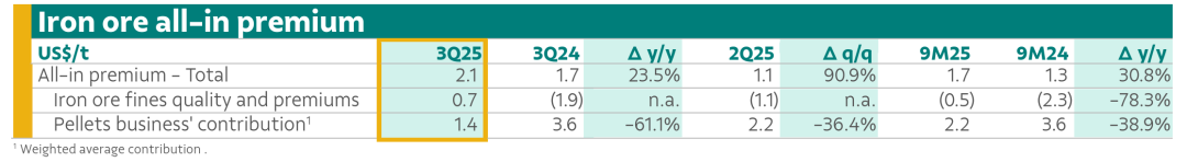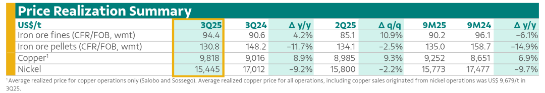 2025年第三季度,铁矿石产量总计9440万吨,同比增长340万吨,增幅为4%,这得益于S11D矿区创下季度产量新高,以及重点项目持续达产。铁矿石销量达到8600万吨,同比增长420万吨,增幅为5%。价格实现同时改善,主要得益于铁矿石粉矿溢价增长(环比增长1.8美元/吨)。球团产量总计800万吨,同比减少240万吨,减幅为23%,反映出市场状况。